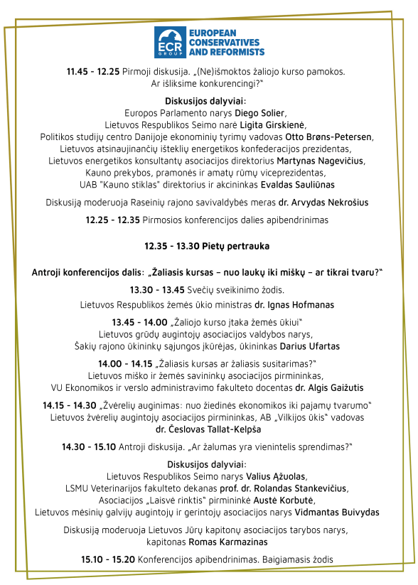 Galingai startavęs žaliasis kursas siekė reformuoti kone visus europinės politikos aspektus – nuo ES ir jos galios bei konkurencingumo tarptautinėje prekyboje klausimų iki žemės ūkio, nuo transporto iki energetikos, nuo išmaniųjų technologijų iki biurų ir namų statybos – sulaukia vis daugiau kritikos. Ekonomikos modelio pertvarka brangiai kainuoja ir ne visada atneša tokį rezultatą ir pasekmes, kokių buvo tikėtasi. Pasikeitusi geopolitinė situacija kelia klausimą, ar neturėtume pirmenybės teikti ekonomikos augimui ir Europos konkurencingumo didinimui?Tad konferencijos „Žaliasis kursas: keliai ir klystkeliai” pranešėjai ir diskusijų dalyviai, bene pirmieji Lietuvoje, pažvelgs į žaliąjį kursą ne tik pro rožinius akinius.Konferencija vyks jau šį penktadienį, t.y. 2025 m. gegužės 23 d. nuo 10 iki 15.30 val. ir bus transliuojama delfi portale.